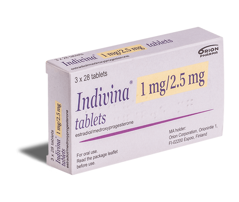 Os comprimidos de Indivina contêm dois ingredientes ativos, estradiol e medroxiprogesterona. Eles são formas dos principais hormônios sexuais femininos, estrogênio e progesterona. Estradiol é uma forma de ocorrência natural do estrogênio e a medroxiprogesterona é uma forma sintética da progesterona.
